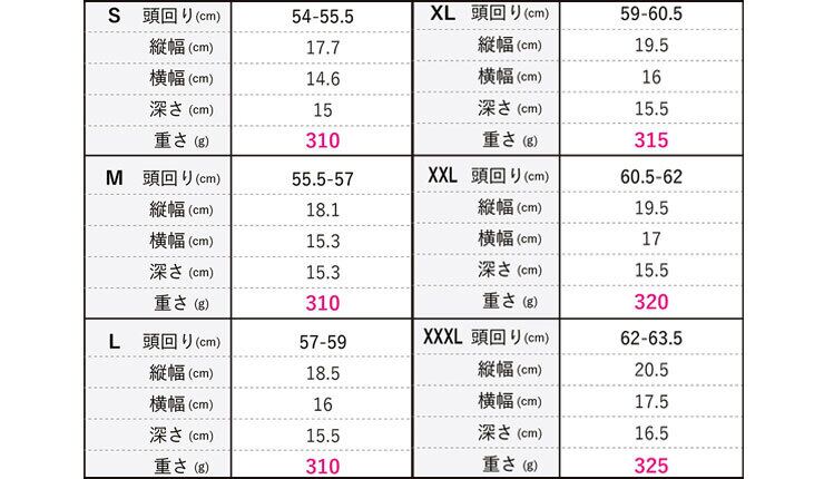 XXL:推奨頭回り寸法 60.5-62/内寸縦幅 19.5/内寸横幅 17/内寸深さ 15.5/重さ 320g